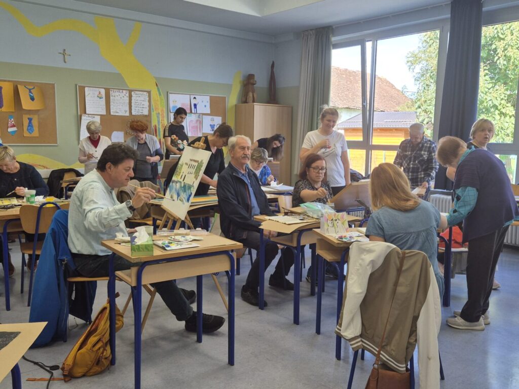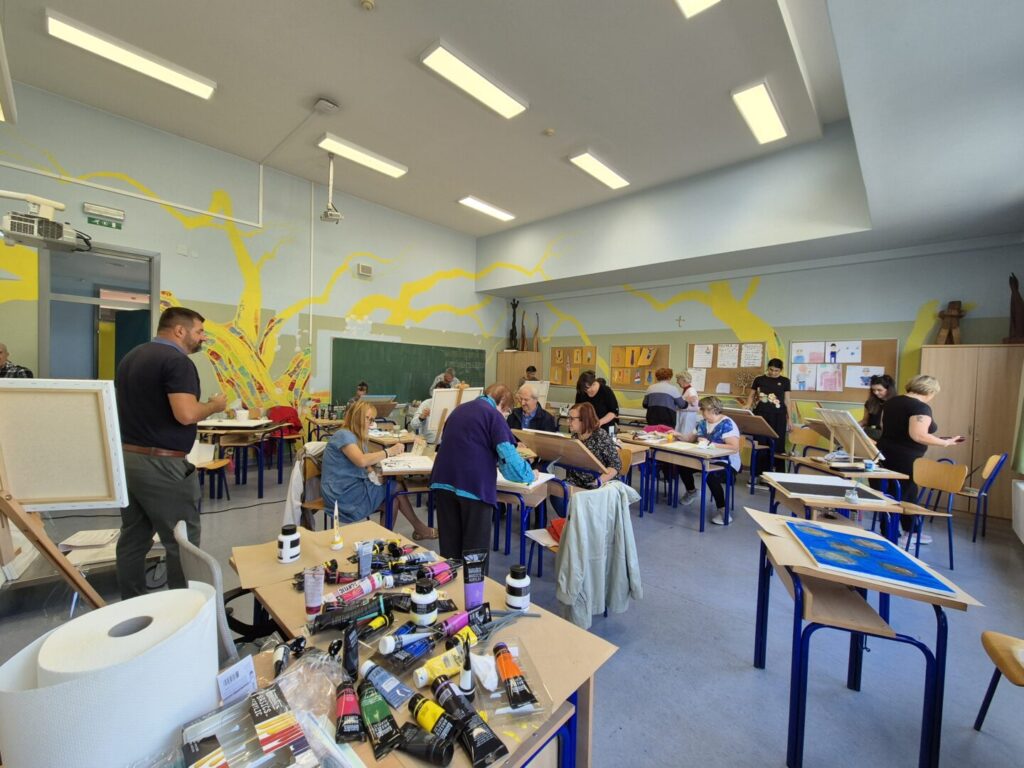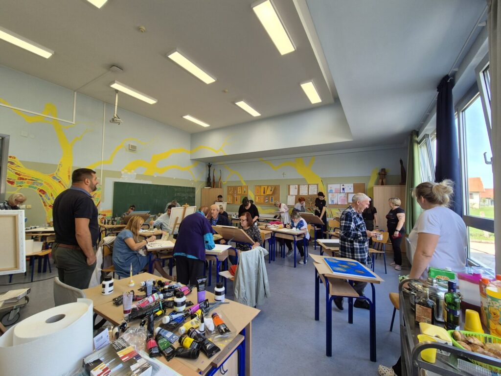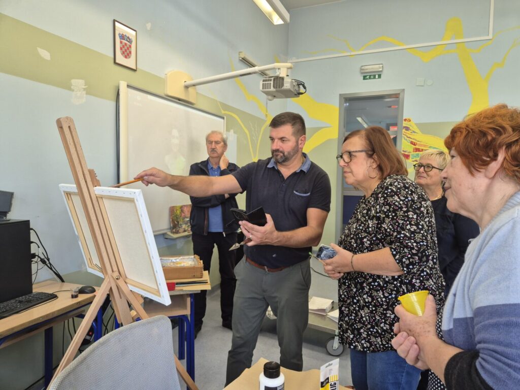 Uz prelijepo druženje, uz srdačan doček ravnatelja škole, gospodina Andreja Peklića, i uz nezaboravne pjesme neprežaljenog Olivera Dragojevića, u likovnoj učionici je sve prštalo od rada, radosti i užurbanosti. Palete pune boja na klupama su dominirale kao rascvjetali pupovi šarenih cvjetova. U trenu su bijela platna procvjetala u čudesne oblike prepoznatljivih detalja ili apstrakcija. Tiha muzika širila se prostorom, a nadglasavali su je smijeh i razgovor dvadeset i pet sudionika. Među nama je bio i akademski slikar Darko Škoda, član Udruge i učitelj likovne kulture Škole. Na visokom štafelaju s posebnom je radošću stvarao svoje novo djelo i usput je zainteresiranima rado i nesebično objašnjavao tehnike miješanja i nanošenja boja. Njegove su ruke letjele bijelim platnom kao roj šarenih leptira. Svaki se čas netko zaustavio pored umjetnika i virnuo u tu ljepotu lakoće stvaranja i poteza kistom i uz njegov vedar osmijeh poslušao i pokoji dobar vic.
