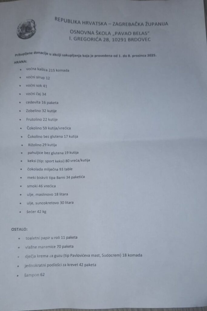 Učenici i djelatnici OŠ Pavao Belas zajedničkim su snagama prikupili donacije za Specijalnu bolnicu za kronične bolesti dječje dobi Gornja Bistra. Učenici 7.A razreda zapakirali su kutije i posložili popise namirnica kako bi donacije bile što preglednije i lakše za raspodjelu. Roditelji su ponudili prijevoz, osigurali kombije te pomogli u ukrcavanju i iskrcavanju brojnih kutija. Zahvaljujući svima koji su se uključili, donacije su sigurno i brzo stigle na odredište. Ponosni smo na zajedništvo, humanost i spremnost naše školske zajednice da pomogne onima kojima je najpotrebnije.